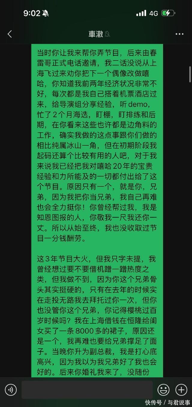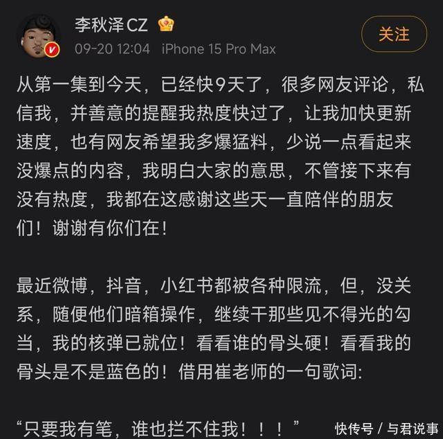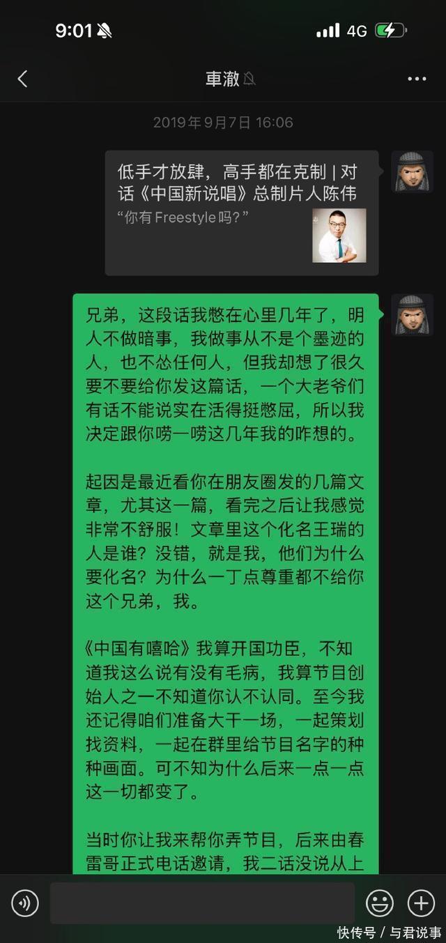 众所周知,说唱OG李秋泽连发十篇文章点名车澈。 他的目的非常直接,就是让车澈和节目给他一个交代。 李秋泽认为,没有他,就没有《中国有嘻哈》这个大火节目。 “我相信人在做天在看,我不是只要你给个交代,我也要让爱奇艺给我这9年一个交代”