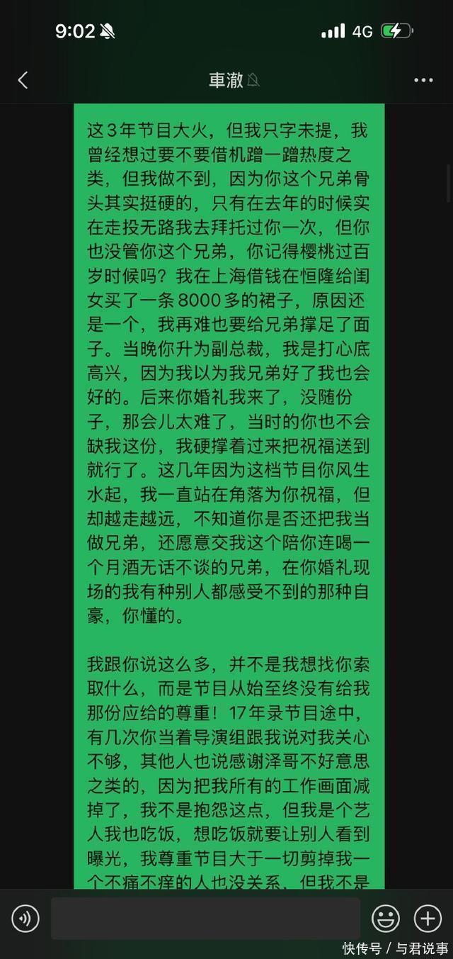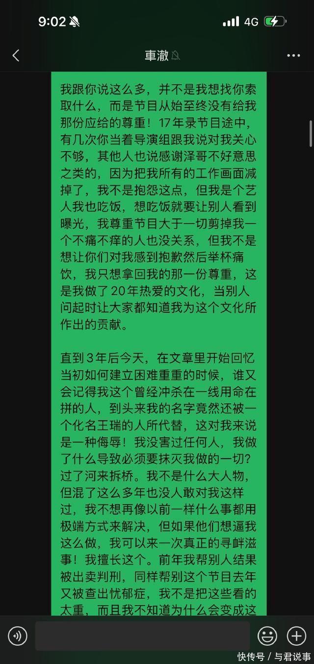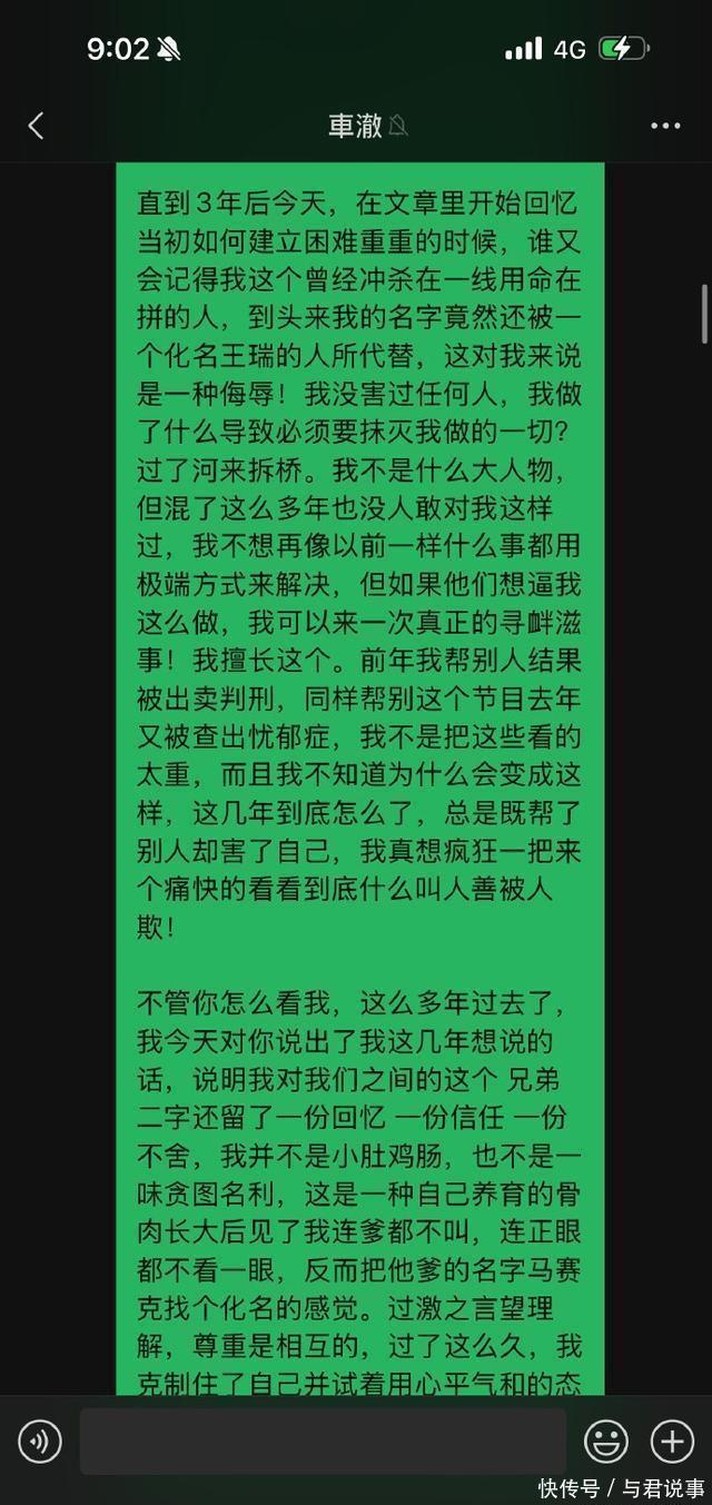而在最近一篇文章,李秋泽因为爱奇艺总裁的采访把他的名字抹去!直接质问车澈。 在陈伟的采访中,李秋泽的名字没有出现在采访之中,却用了一个王瑞的化名。 车澈回应“是我对兄弟关心不够”,并赶快约李秋泽吃饭,安抚李秋泽。 这件事,让李秋泽直接破防。 之后,李秋泽直接发了长文质问车澈,展示了当时的聊天记录。 “到头来我的名字被一个化名王瑞的人所代替,这是一种侮辱”