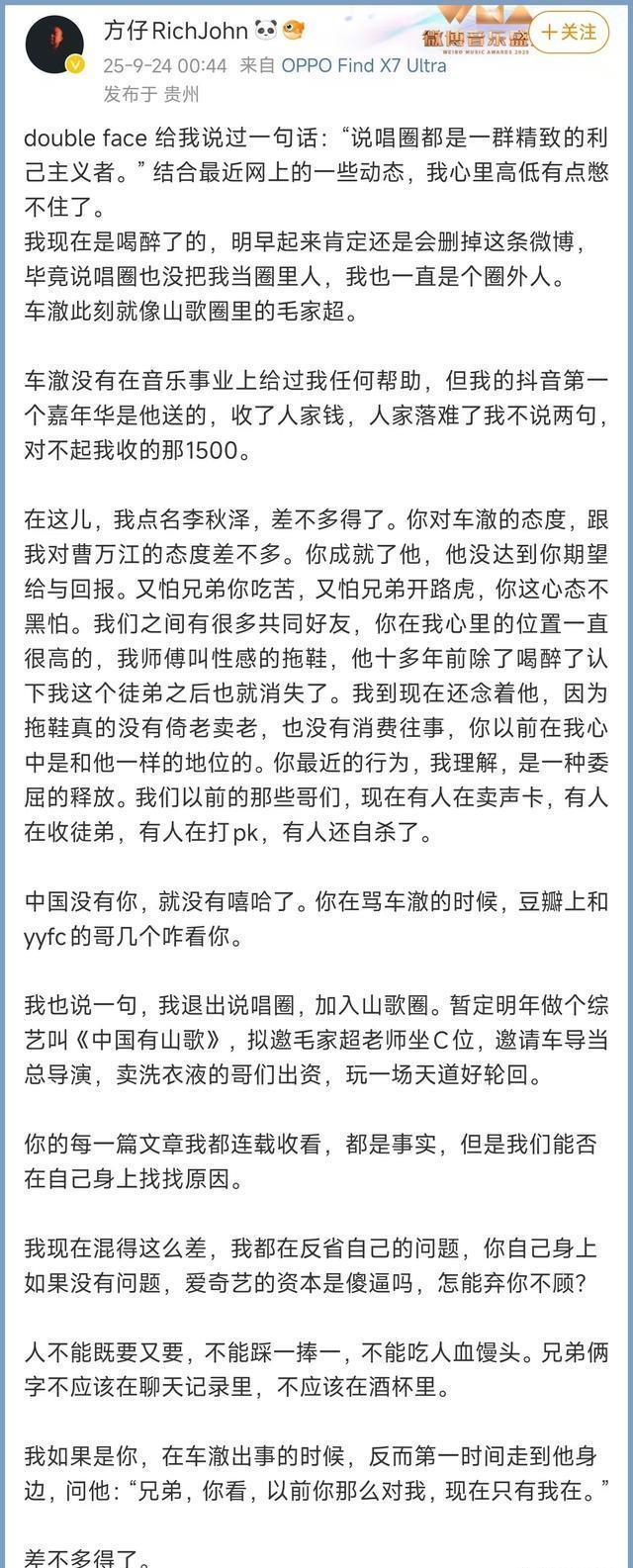 方仔突然发文,点名李秋泽,劝李秋泽差不多得了。 “我点名李秋泽,差不多得了。你对车澈的态度,跟我对曹万江的态度差不多。你成就了他,他没达到你期望给与回报。又怕兄弟你吃苦,又怕兄弟开路虎,你这心态不黑怕。 中国没有你,就没有嘻哈了?我现在混得这么差,我都在反省自己的问题,你自己身上如果没有问题,爱奇艺的资本怎么可能弃你不顾?”